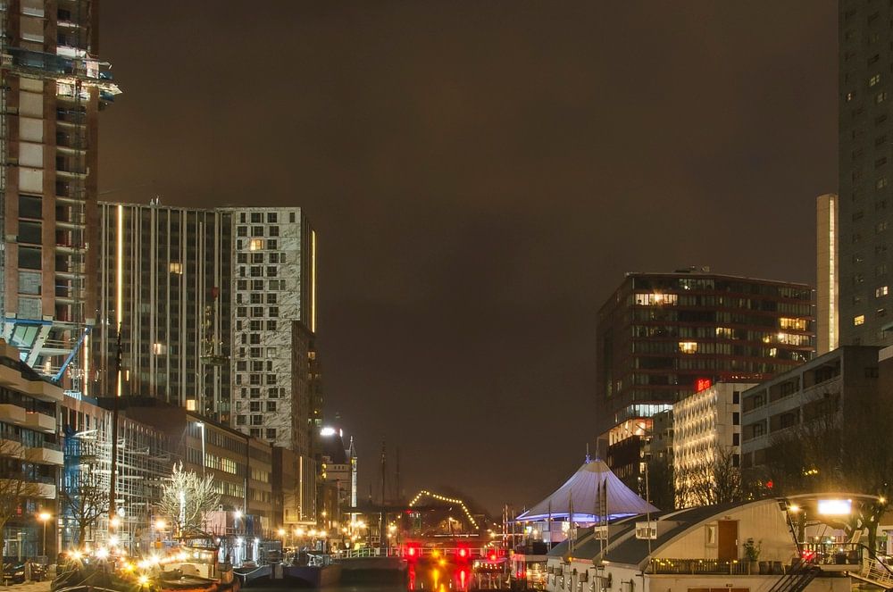 It's eight o'clock, Rotterdam is waking up. And part of Rotterdam is of course already awake earlier but at eight o'clock in early January it is still so dark that it might as well be the middle of the night. Were it not for the fact that in the residential towers, on the ships and on the construction sites around the Wijnhaven, a multitude of light sources show that many people are already active.
