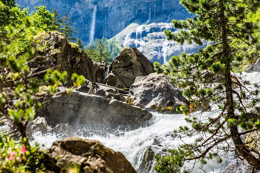 A wild mountain stream in the Austrian Alps carves its way powerfully through a rugged rocky landscape. At the center of the image, the stream is partially hidden by rocks, while splashing water droplets catch the sunlight, adding vivid energy to the scene. In the left foreground, a partially visible pine tree grows from a rock,…