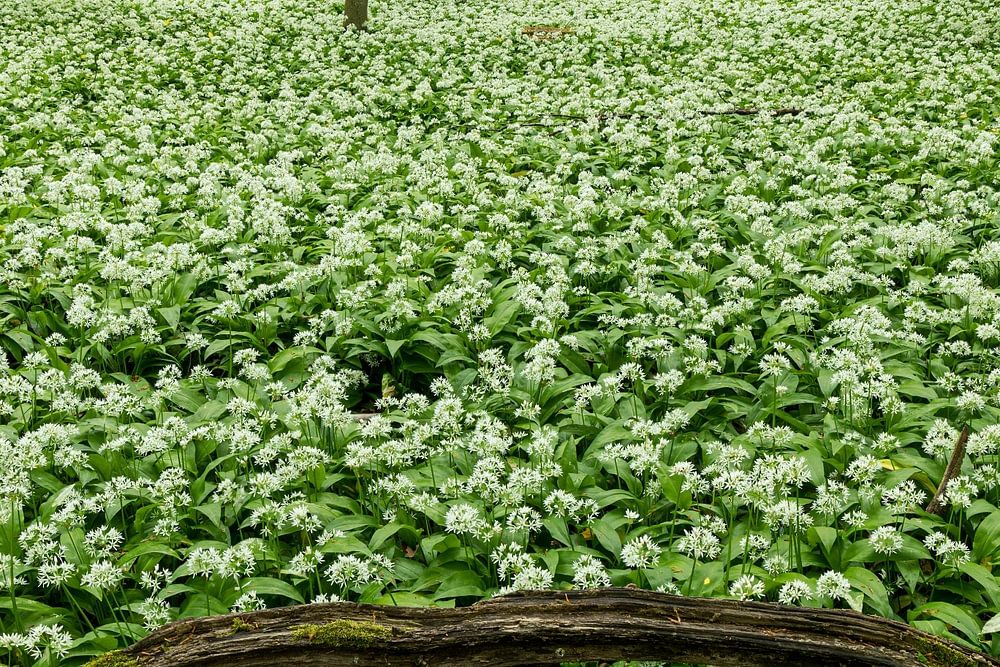 A forest full of beeches and on the ground a carpet of wild garlic as far as the eye can see
