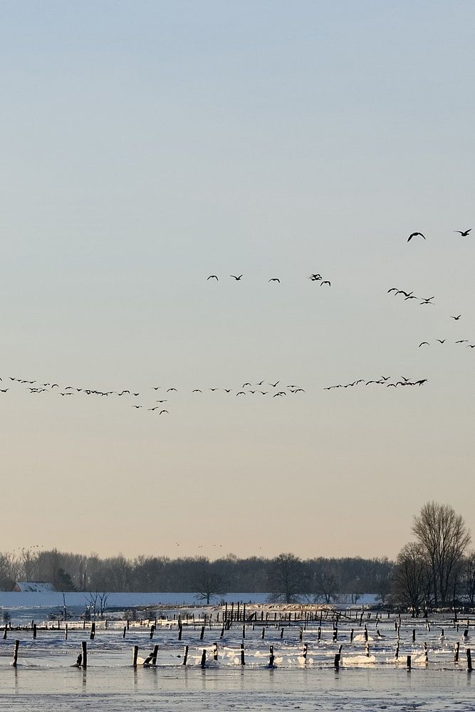 The picture is typical for the lower Lower Rhine. The special weather situation with ice and frost and blue sky, the vastness of the open landscape, the flying wild geese...