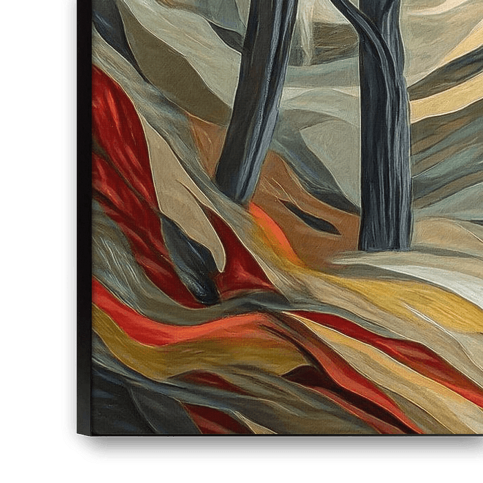 Swirling leaves dance around tall, slender trees. The scene is painted with dynamic brushstrokes and captures the vibrant energy of autumn.