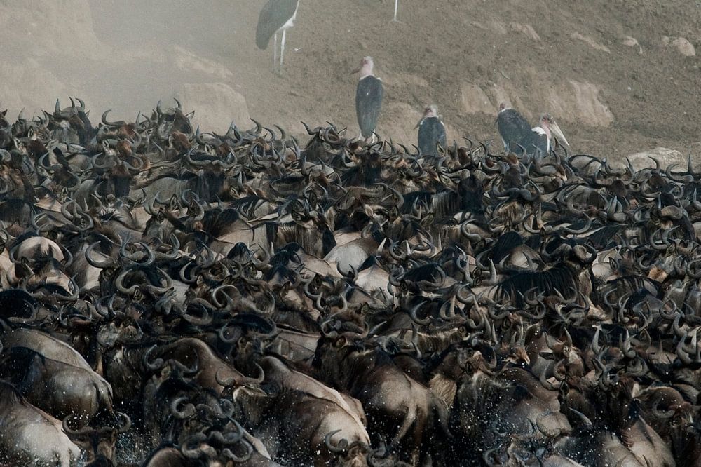 Wildebeests, or WIldebeests, cross the Mara River in Kenya's Masai Mara during the annual migration between Tanzania and Kenya. Many animals die. Zebras also go along and Marabous along with Crocodiles are already waiting for prey.