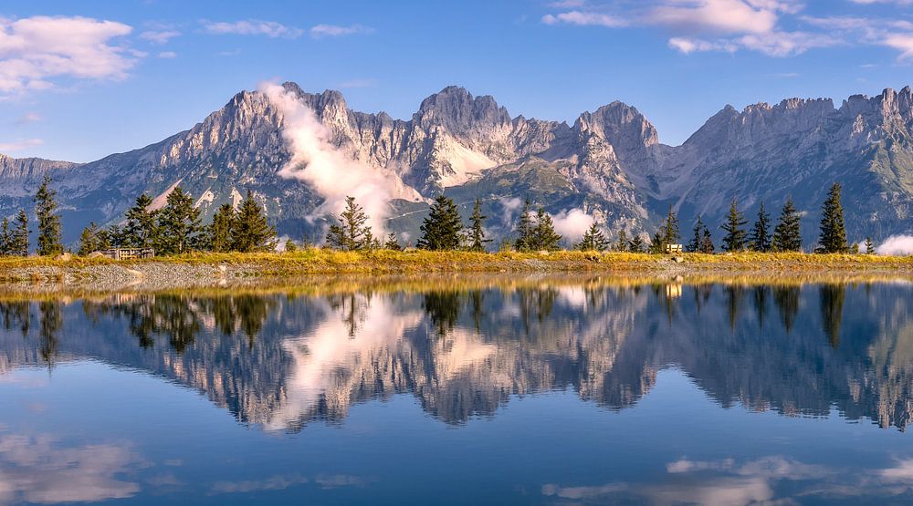 The Kaisergebirge is reflected in the idyllic mountain lake