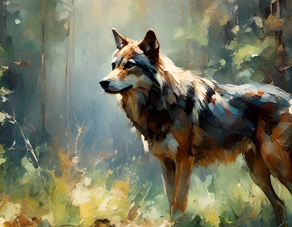 A lone wolf stands alert in a vibrant forest clearing, with sunlight filtering through the tall trees. Its fur reflects various shades of brown and grey, contrasting beautifully with the surrounding greens and hints of sunlight.