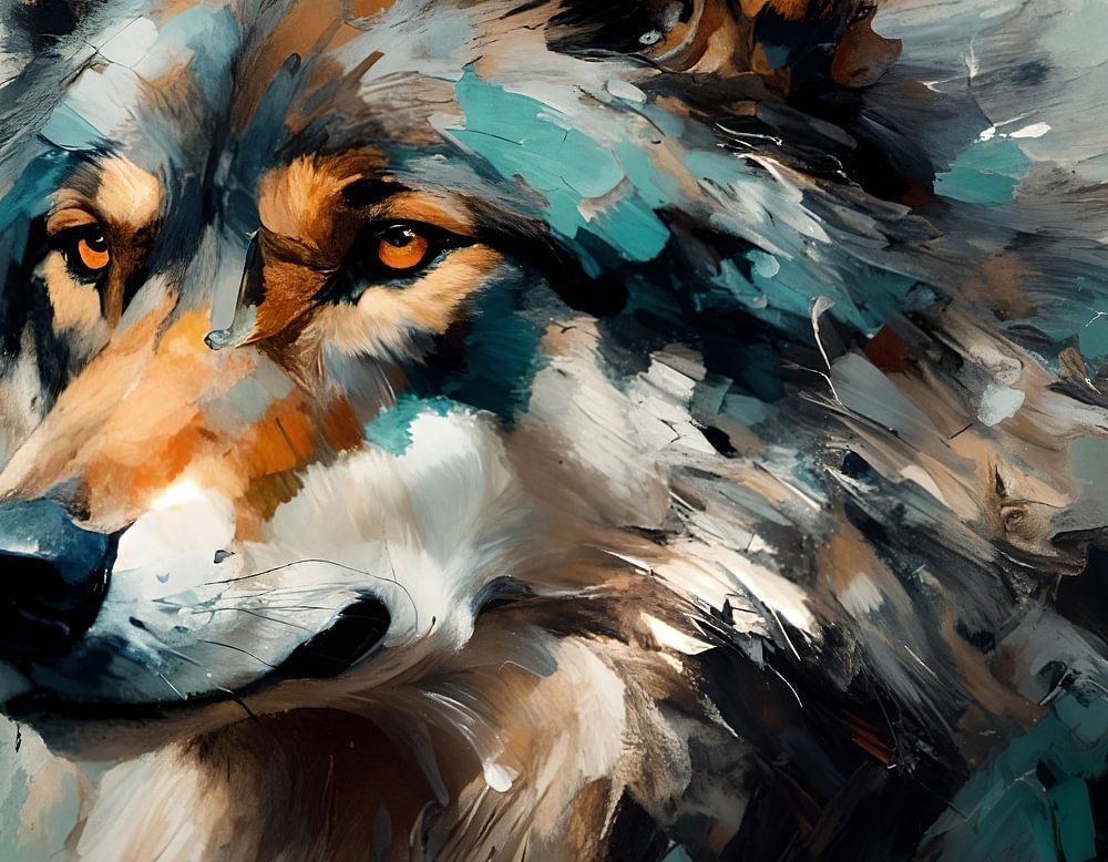 A striking wolf gazes forward with intense eyes, portrayed in a style that fuses realism with abstract brushstrokes. The background suggests a misty, forested landscape that complements the wild essence of the animal.
