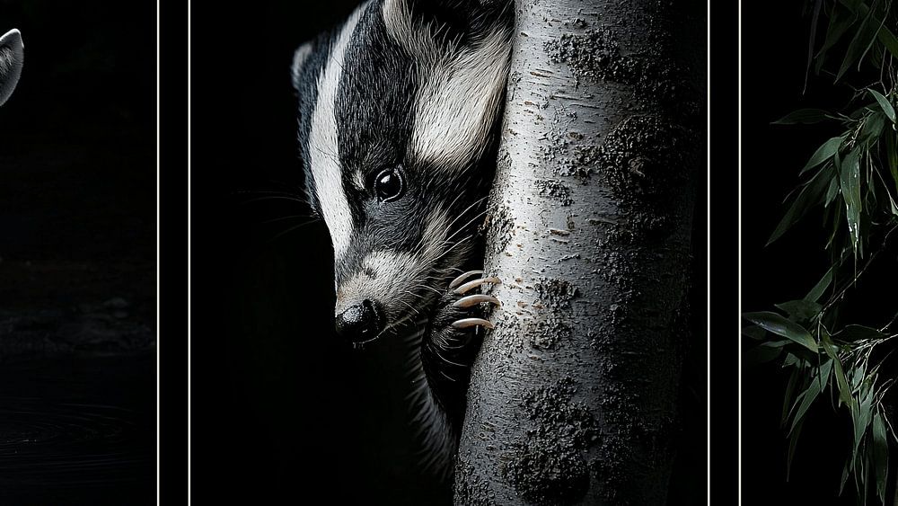This photorealistic triptych exudes a serene and timeless beauty. Against a dark background, three iconic animals are impressively rendered in black and white, with each panel telling its own story. On the left is a zebra quietly drinking water, the lines of its striped fur contrasting beautifully with the reflective surface of the water. In the centre is a badger surrounded by the roots of an old tree, a scene that exudes strength and connection to nature. The right panel shows a panda enjoying a moment in its bamboo forest, a symbol of tranquillity and rarity.