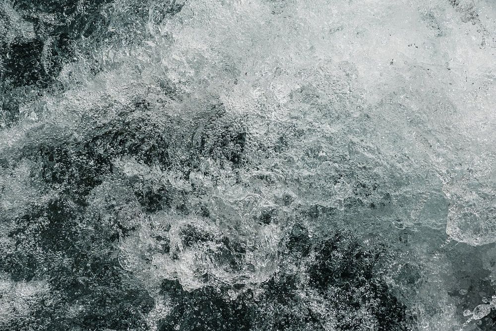 The picture shows a detailed image of splashing water, moving wildly. The colour of the water is green, probably due to the reflection of nature around it or algae in the water. The water splashes up forcefully, indicating the proximity of a waterfall. The shot captures the movement of the water in the moment as it spreads into small drops and foam. This gives the photo a dynamic feel, as if you can almost feel the power of nature.
