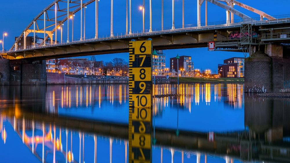 Deventer is an old Hanseatic city located on the river IJssel in Overijssel, Netherlands. Here we see the Wilhelmina bridge over the IJssel river during the blue hour.