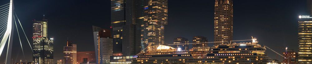 View of the Wilhelminakade and Erasmus Bridge in Rotterdam at night with the Aidamar moored at the Holland-America quay.