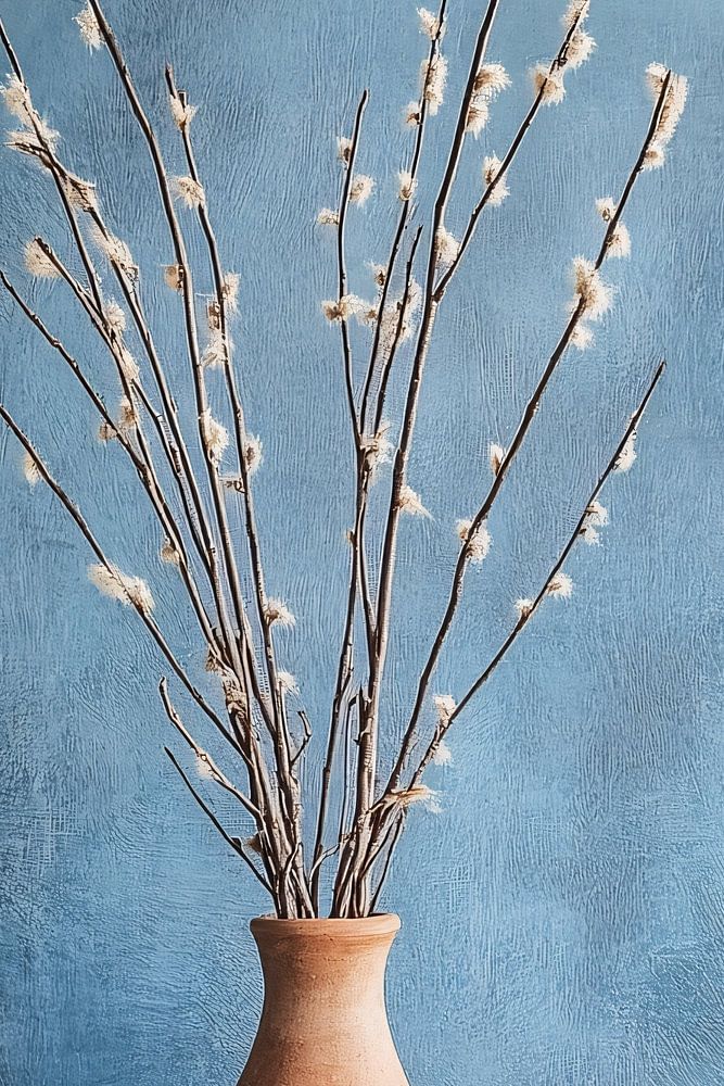 A beautiful minimalist design featuring a terracotta vase filled with graceful willow branches against a serene blue background. This decorative piece exudes simplicity and natural elegance, perfect for creating a tranquil atmosphere in your interior. Ideal for the living room, hallway or bedroom, and suitable for a Japandi or minimalist style. The soft colour combination of earth tones and blue makes it a timeless and versatile decorative piece.