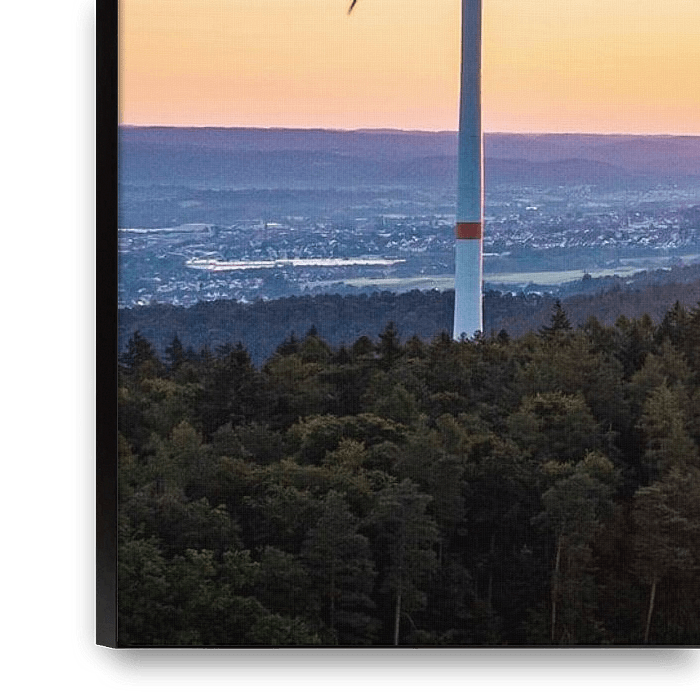 Aerial view of wind turbines in a wind farm near Schorndorf in the Schurwald at sunrise, Baden-Württemberg, Germany