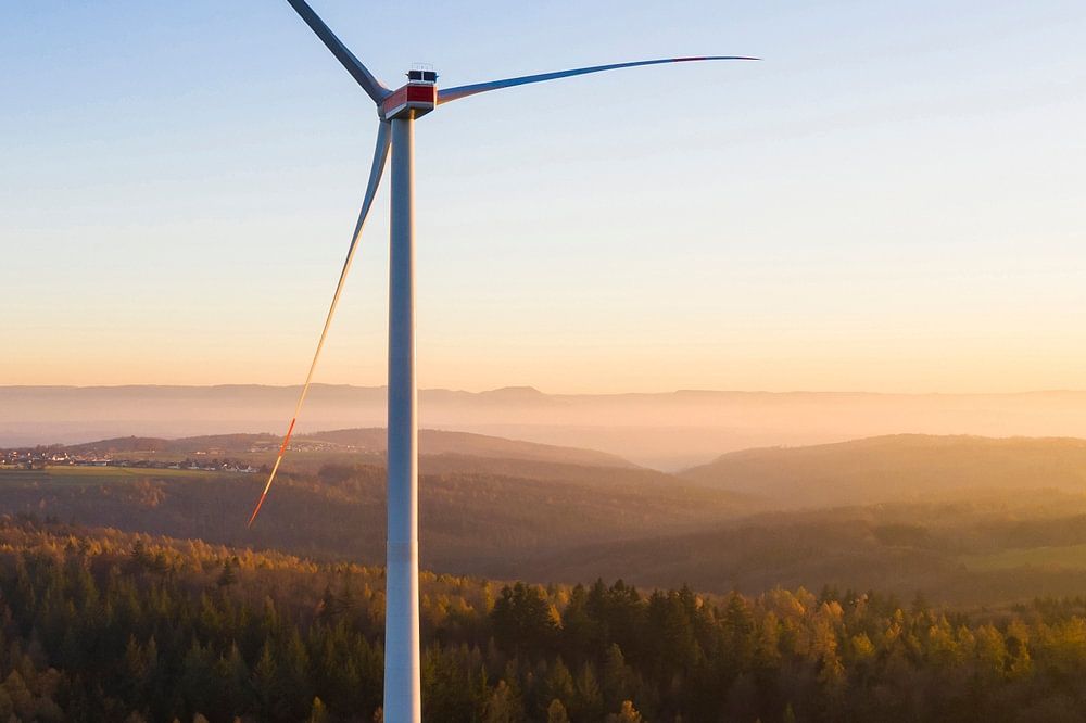 Wind turbines near Schorndorf in the Schurwald, Baden-Württemberg, Germany.