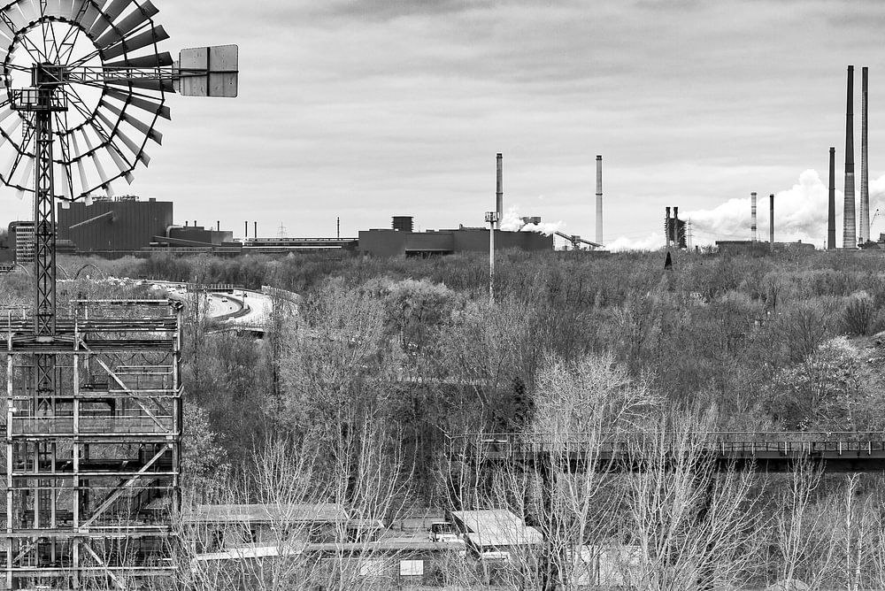 Overview over the former ore bunkers of the Thyssen Krupp blast furnaces located in the heart of the Ruhr region near Duisburg. In the foreground is a characteristic windmill. In the background, smoking chimneys of surrounding industry. Landscape park Duisburg-Nord in North Rhine-Westphalia. This photo was taken in March 2019. Ruhrpott