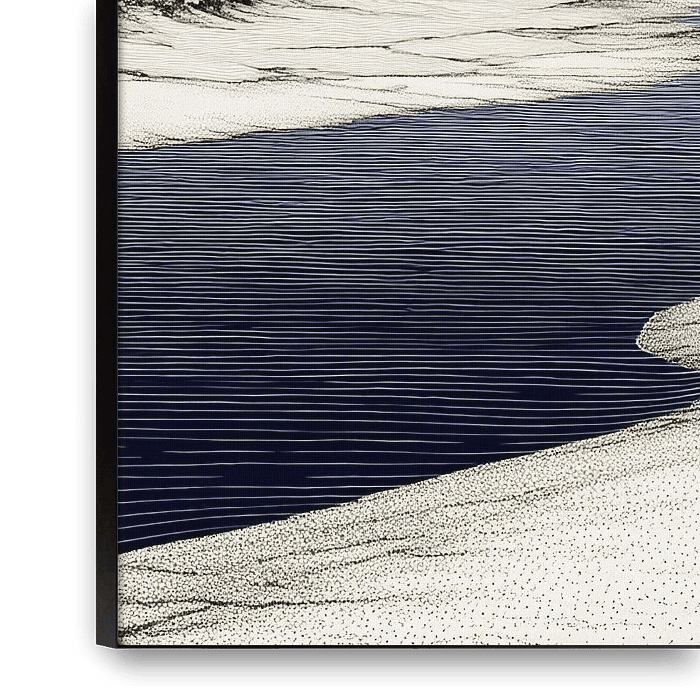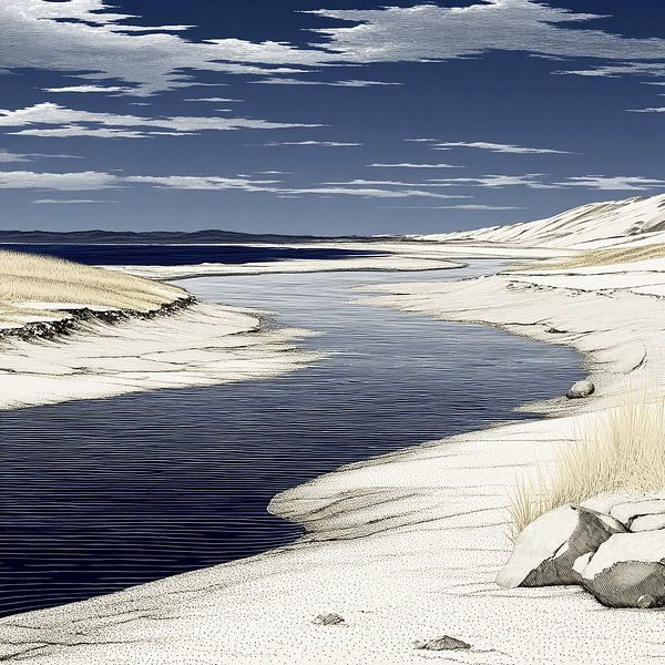 Landscape illustration of a dark water channel winding its way through light-coloured dunes to the sea, under a deep blue sky with clouds. The work evokes the serene tranquillity of a long, quiet walk through the dunes, along a water channel that naturally draws your gaze to the distant horizon. You feel space, fresh air and the…