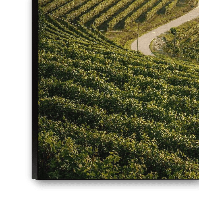 A winding country road, a common sight in the area, cuts through the vineyard terraces, leading the eye toward the distant valley and the warm, golden light of the late afternoon.