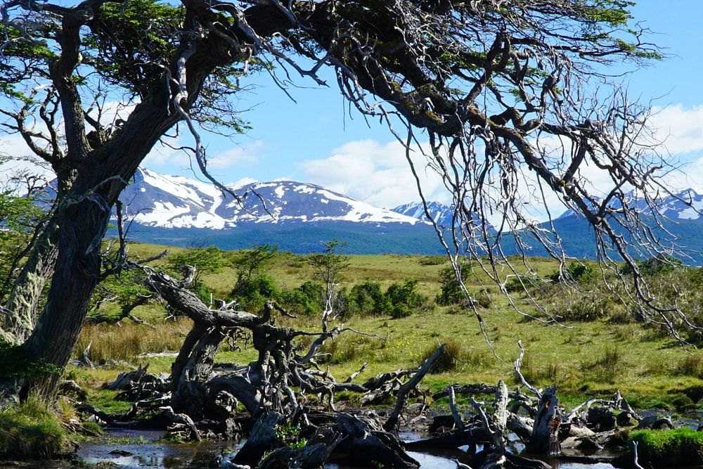 On a hike near Puerto Williams in Patagonia, we come across this sinuous tree. In the background, you can see the mountains of Patagonia.