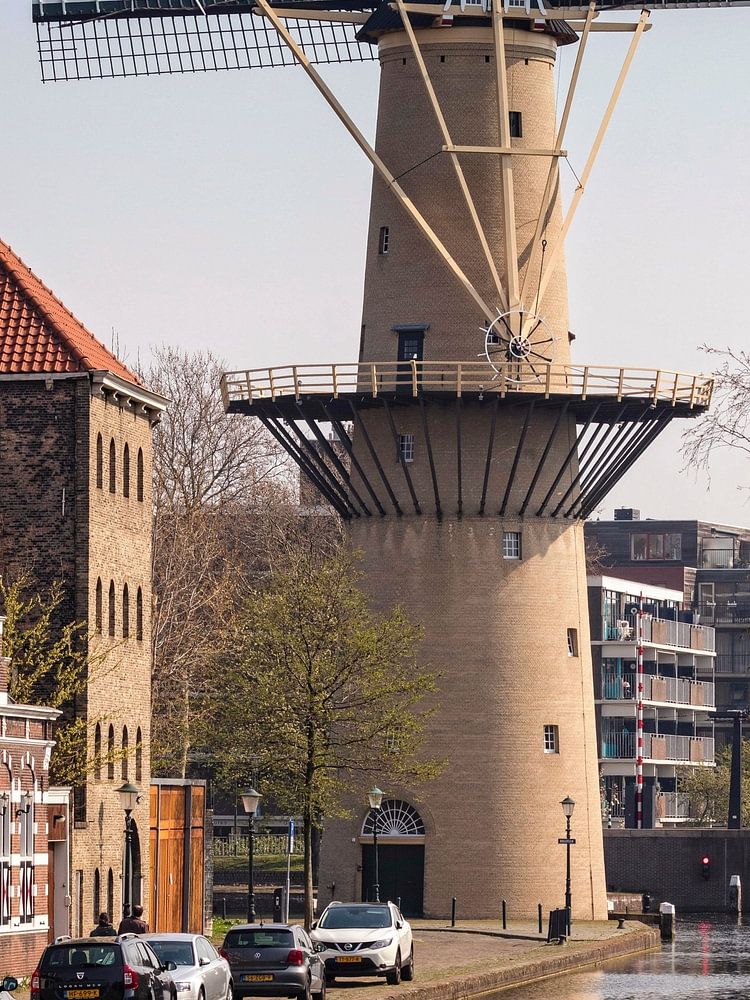 City view of the canal with windmill in the historic center of Schiedam (South Holland, Netherlands).