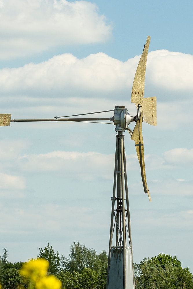 In a meadow stands this windmill that regulates the water levels in the ditches. The windmill blends into the agricultural natural landscape with flowering grasses, riparian plants with yellow flowers and the typical cloudy sky on a steady day.