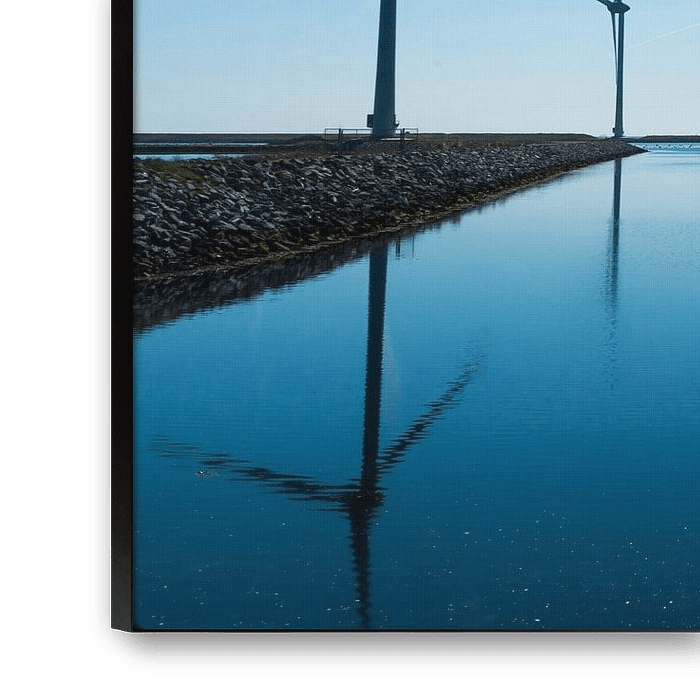 This picture exudes complete tranquillity. The windmills stand idly by at the moment. There is not a breath of wind making the water act as a mirror. And the sky is clear.