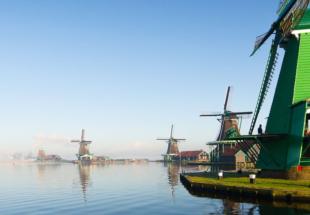 De windmolens aan de Zaanse Schans bij wegtrekkende ochtendmist