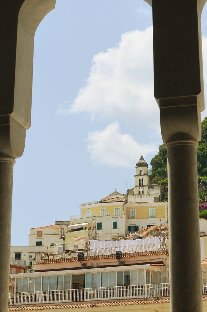 The Amalfi town and architecture, seen from a window of the St. Andrew's cathedral, a landmark of this city of the Sorrento Peninsula, Italy.