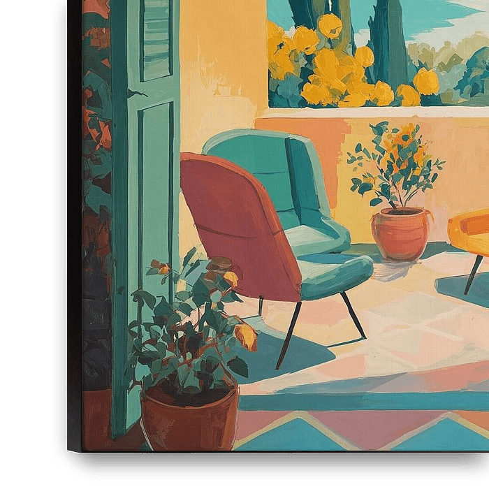A view of a Mediterranean landscape from a warmly lit room, where cypress trees and hills reflect in the golden light. Two chairs await a moment of contemplation, while climbing plants and flowers blur the line between inside and out. This artwork exudes the nostalgic beauty of vintage travel posters, cast in a modern, layered color…