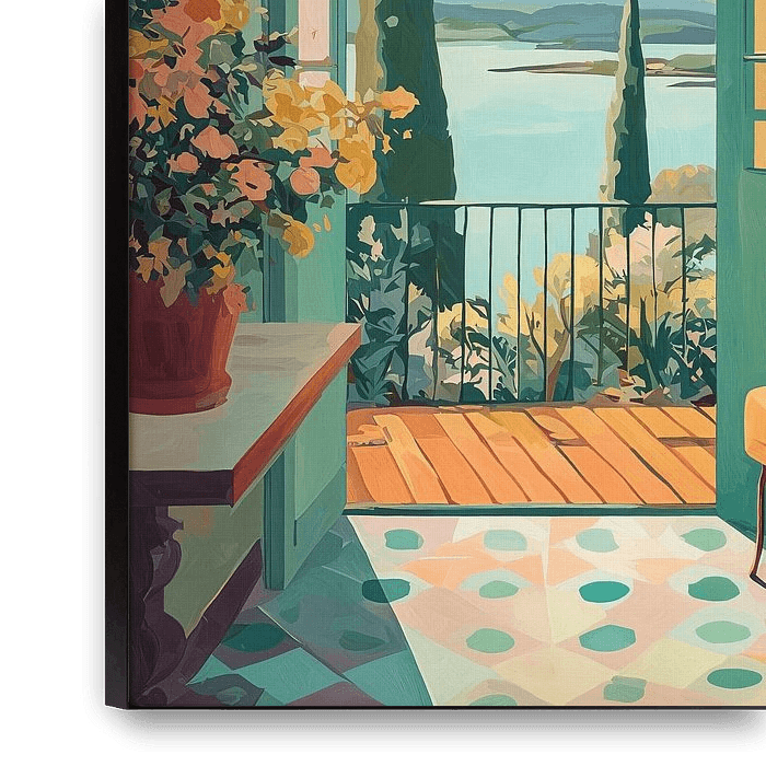 A refined illustrative artwork that creates an aesthetic escape. Through open green doors, we look out onto an idyllic Mediterranean landscape with velvety mountains and a calm azure sea. The interior exudes tranquility with warm woodwork, colorful plants, and a softly upholstered chair, while the color palette of warm ochre, rosy…