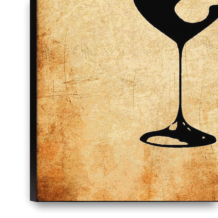 The image features a black silhouette of a wine glass against a textured, aged parchment background. The silhouette is formed by a splash of liquid, creating the shape of two faces in profile, seemingly kissing. The faces are outlined in a bold, black stroke, while the background is a warm, earthy brown with subtle hints of orange and…