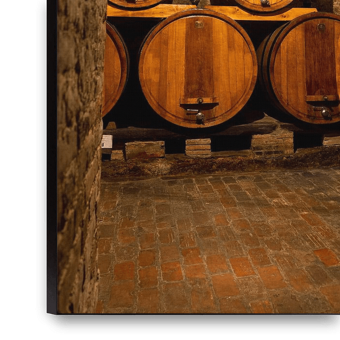 Beautiful wine cellar in Tuscany, Italy, with stacked wooden wine barrels