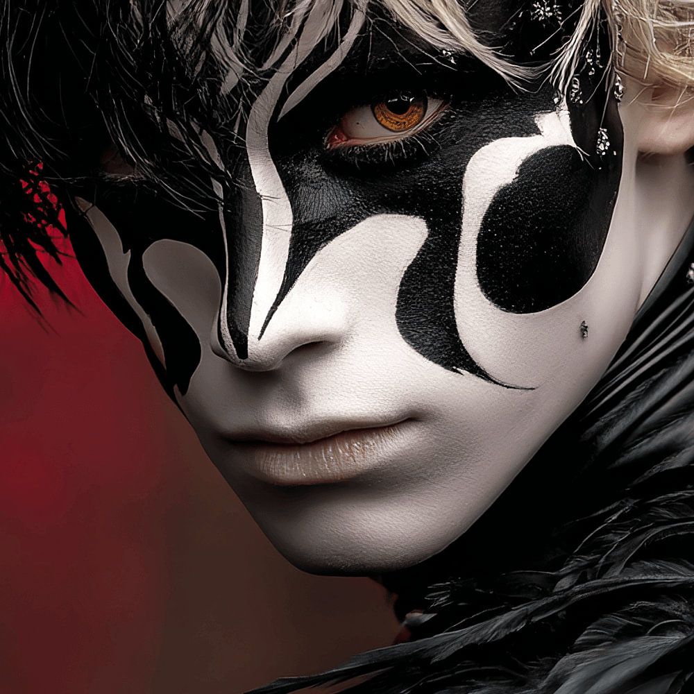 This dramatic portrait shows a figure with contrasting black and blonde hair, dressed in a black feather jacket against a fiery, red background.