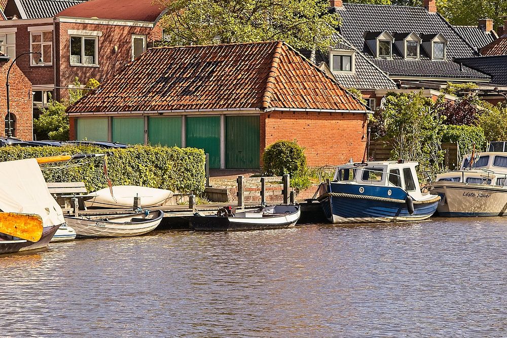 Picturesque village scene along the waterfront in historic Groningen town of Winsum.