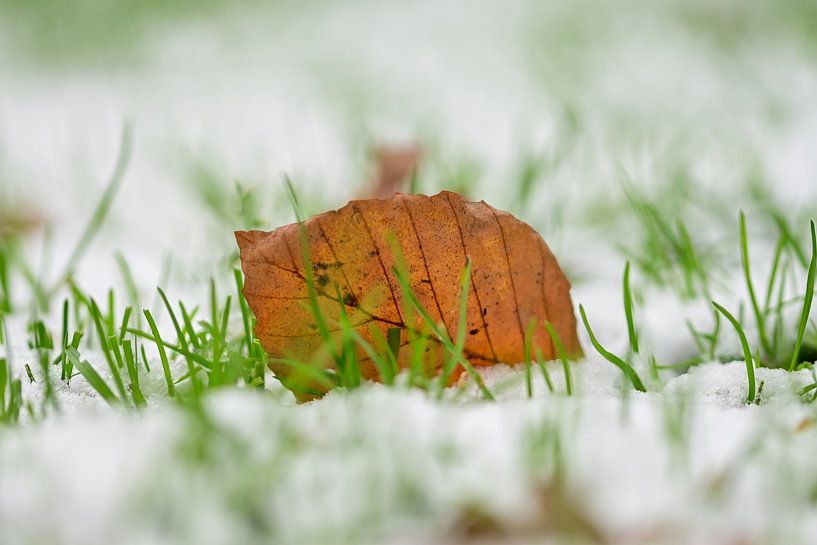 Buy the photo Winter Contrast: Autumn Leaf in Snow by Kristof Leffelaer on canvas, ArtFrame, poster and wallpaper, printed on demand in high quality.