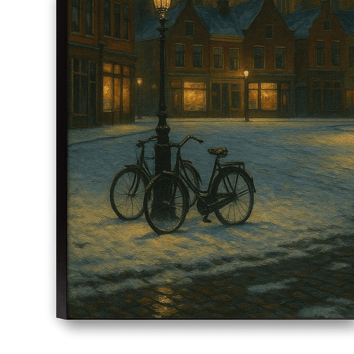 Snow blankets the Grote Markt of Haarlem, transforming the historic square into a cathedral of silence. The Grote Kerk of St. Bavo rises in the background, its warm sandstone façade catching the last amber hues of twilight. Lamps flicker along the cobblestone, their halos diffused by the drifting snow. A few bicycles rest patiently beneath the lamplight — familiar sentinels in a city that seems to pause between breath and prayer.