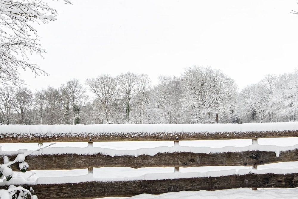 This typical fence stands out nicely against the white blanket of snow.