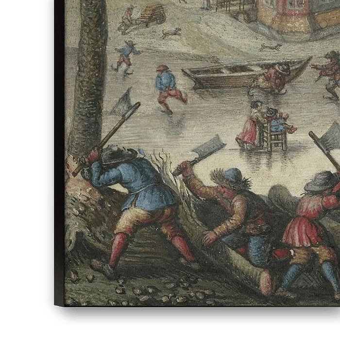 This miniature scene is cleverly composed to display both a vast sense of space, and a detailed view of life on the frozen canals. In the background, at right, the faraway towers of the Hague are visible. In the middle ground, wealthy citizens take sleigh rides, and line up to buy hot drinks from a vendor. In contrast with this, and the assorted frolicking dogs and children, the foreground features peasants hard at work cutting wood. Artist Jan Berents also creates atmospheric perspective with the considered placement of trees, flag poles, and church towers.