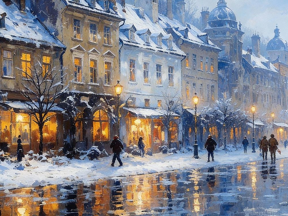 An impressionistic winter scene in which warm city light reflects on a wet street. The combination of cool winter tones and soft glow creates a serene, dreamy atmosphere that exudes tranquillity and elegance.
