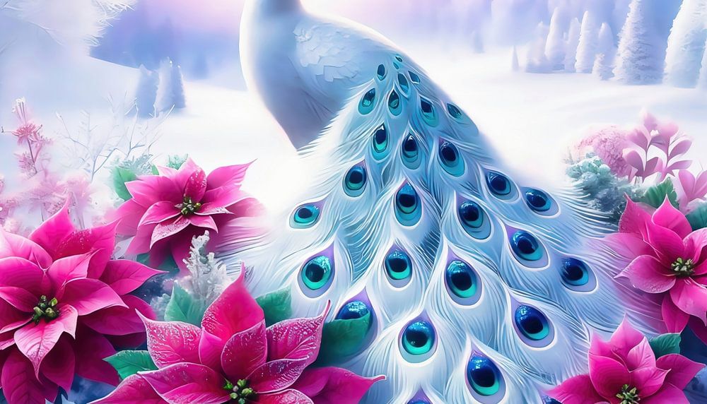 "Winter Majesty" shows a graceful white peacock showing off in a crystalline winter world. The setting consists of snow-covered trees, soft pastel colours and a peaceful sunrise that gives the sky a dreamy glow. The peacock is surrounded by a rich wreath of vibrant pink poinsettias, icy blue flowers and delicate winter twigs. The…