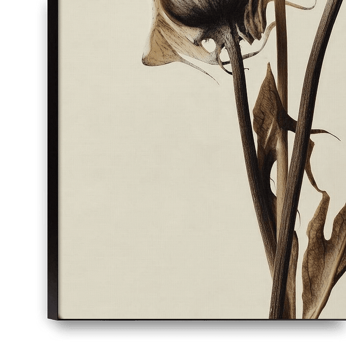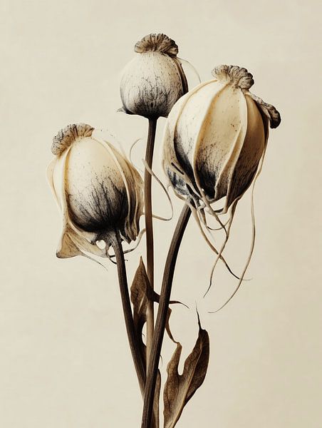 A minimalist botanical artwork featuring delicate poppy-like seed pods rendered in soft ivory and charcoal tones, with fine ink-like textures and an airy, contemplative mood