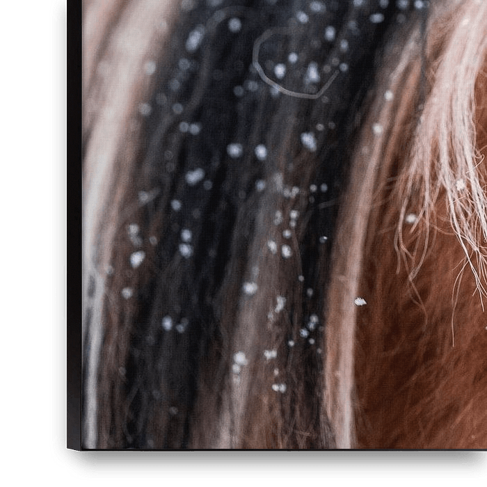 This beautiful close-up image shows the delicate details of a horse's ear and mane covered in fine snowflakes. The rich colours of the coat contrast subtly with the cool white of the snow, while the dynamic movement in the mane adds a sense of vibrancy. The soft focus on the background emphasises the intimate nature of the moment, which…