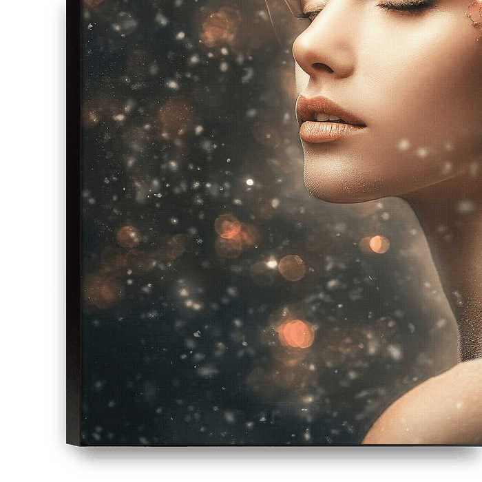 A fairytale portrait of a woman with a winter crown of pine branches, lights and snowflakes. This artwork exudes warmth and magic, perfect for a festive atmosphere or to add a cosy winter look to your interior.