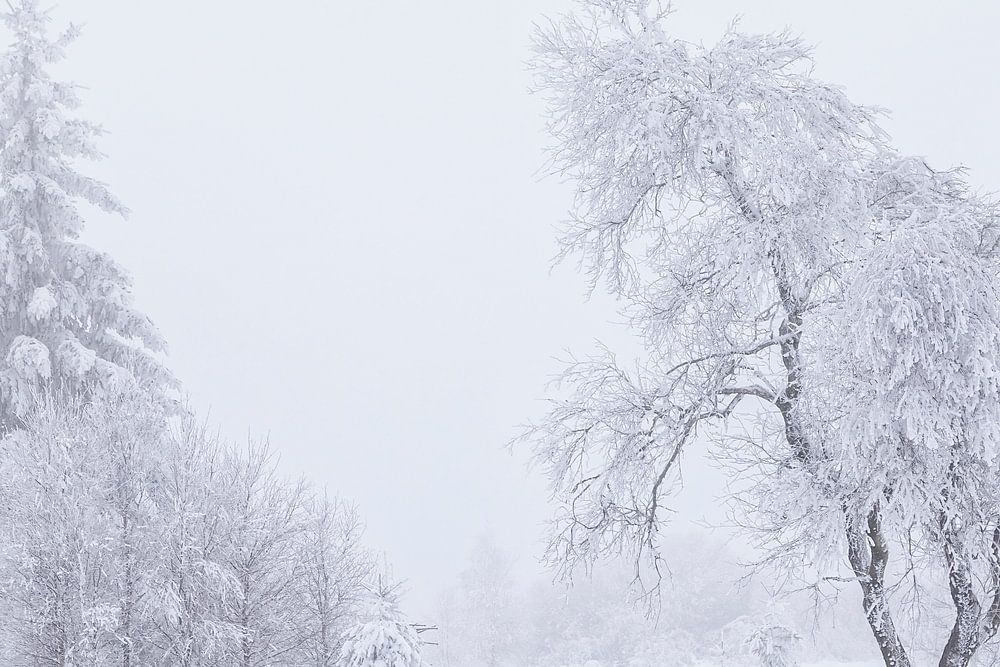 This picturesque image in Belgium's enchanting High Fens shows the pure, unspoilt beauty of a winter day. In the centre stand two majestic trees, their branches heavily laden with a thick layer of fresh snow. The serene stillness of the surroundings is enhanced by the grey, misty sky that reflects the cold and calm atmosphere of the moment. More trees can be seen on the left side of the picture, each covered with their own shimmering layer of snow, adding to the feeling of endless winter splendour.