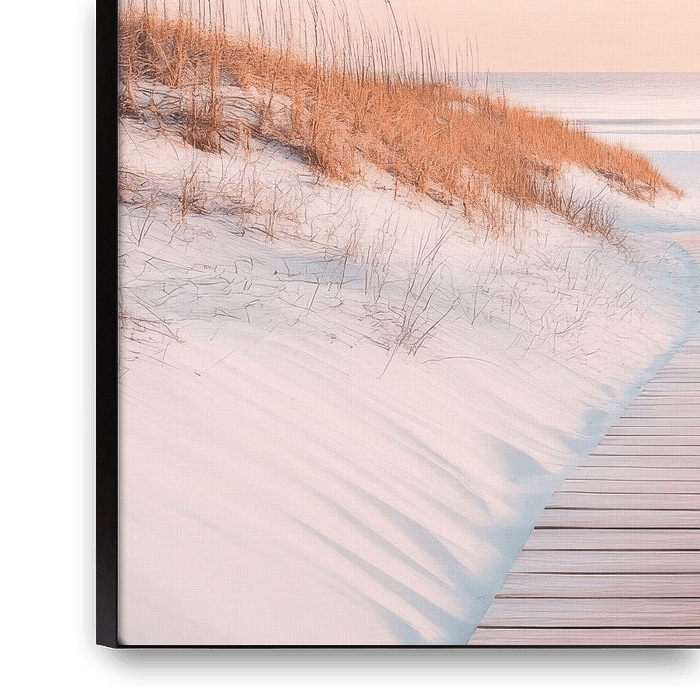 A gentle wooden walkway winds its way through glistening snow, surrounded by gentle dunes and soft grass. The sky shines in soft pastel colours, while the sea glistens invitingly in the distance. This peaceful scenery invites you to take a contemplative walk, where tranquillity and nature merge harmoniously.