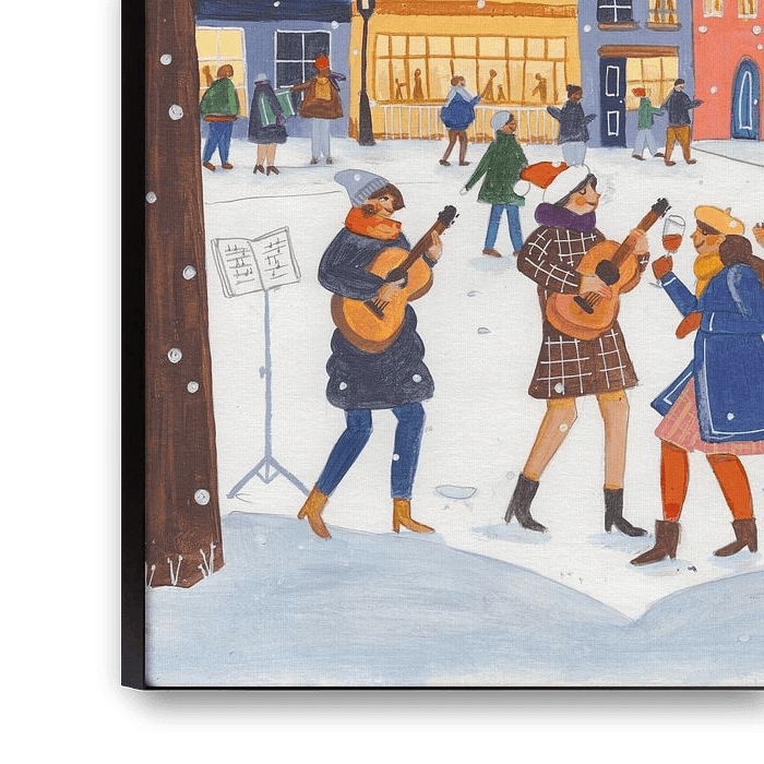 A lively and festive winter scene in the middle of an atmospheric city square! Under the twinkling lights and gently falling snow, musicians play cheerful melodies while onlookers enjoy the music. The colourful houses, decorated Christmas tree and warm windows make the scene extra charming and full of December magic.