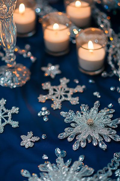 A sparkling sea of glittering snowflakes, framed by soft candlelight, adds a magical touch to any festive table. The deep blue tablecloth provides an elegant contrast to the crystal accents, reminiscent of frosty winter days. Perfect for a stylish living room or for festive occasions, this decoration brings atmosphere and glamour to any room.