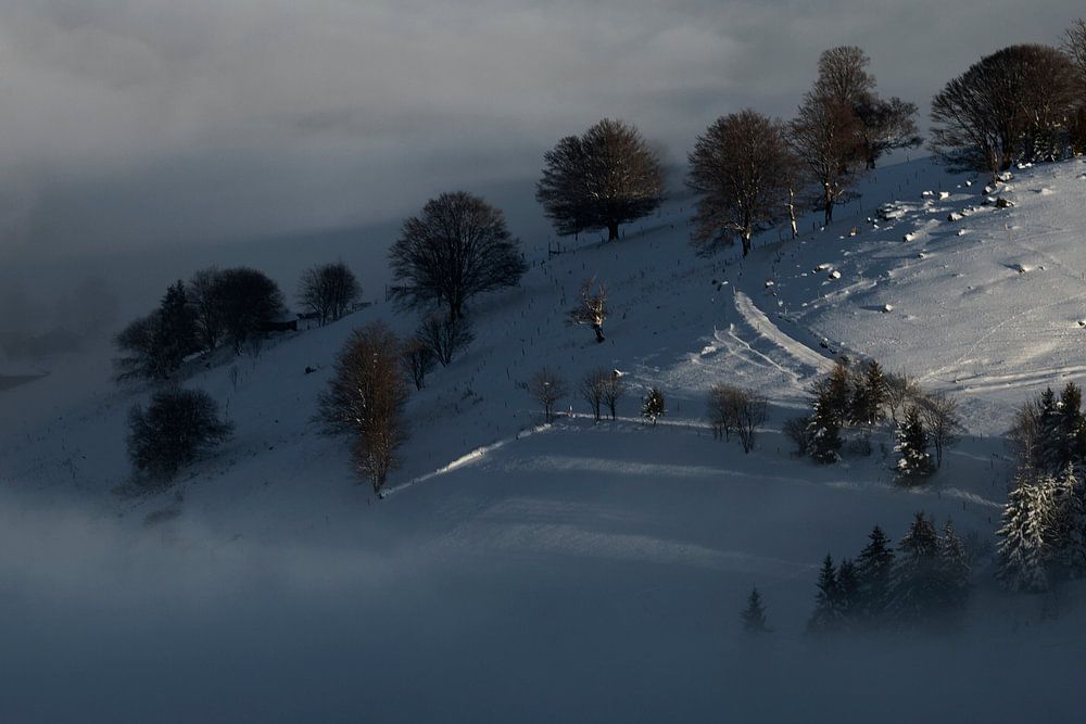 Winter evening with fog, Hofsgrund, Schauinsland, Black Forest, Baden-Württemberg, Germany