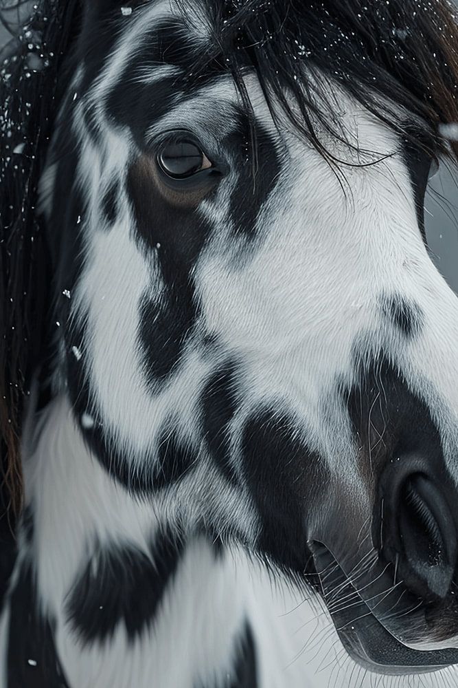 This artwork presents a beautiful piebald horse whose unique coat pattern blends with the soft grey of the winter sky. The animal's dark patches stand out like fine brushstrokes, accompanied by snowflakes falling softly on its mane. The clarity and tranquillity of the picture radiate an elegant simplicity that transports the viewer into a world of peace and quiet beauty. The interplay of nature and animal, depicted in this sensitive portrait, reflects the quiet harmony of winter. Ideal for lovers of horses and natural elegance, this work promises to bring a sense of contemplation and awe to any room.