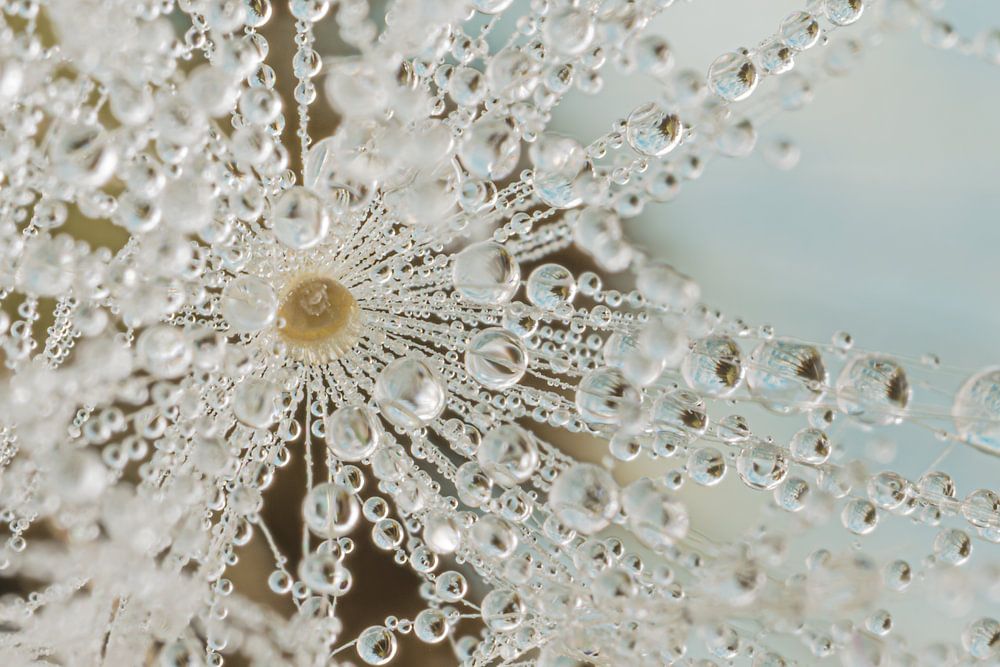 Central in about the centre of the photo is a tuft, with lots of tiny water droplets hanging from it. These give a nice effect because you can see parts behind in some of these droplets. If you zoom in on the photo, you can see this effect nicely. The light blue colour in the background gives a nice soft atmosphere to the photo. It almost feels wintry. Like an ice crystal in a cold environment.