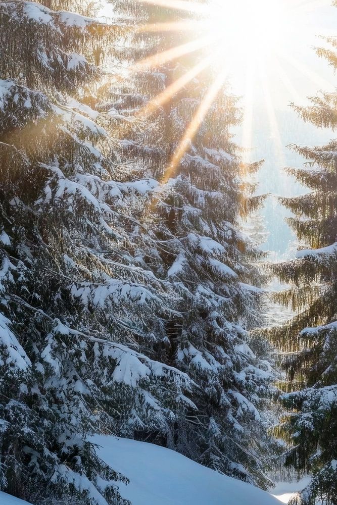 A radiant view of the sun through a dense snowy landscape transforms the wintry scenery into a glittering fairy tale. Tall, snow-covered fir trees frame the gentle path, while the light dances sparkling on the smooth blanket of snow. The tranquil atmosphere invites you to enjoy the magic of frosty nature and leave everyday life behind.