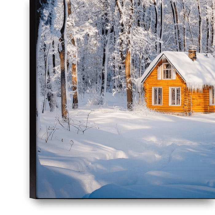 This enchanting little hut stands out from the snow-white winter landscape with its bright yellow colour. Surrounded by majestic, snow-covered trees, it radiates cosiness and warmth. This picture is ideal for the living room, where it creates an inviting and cosy atmosphere that brings the beauty of nature into the home.