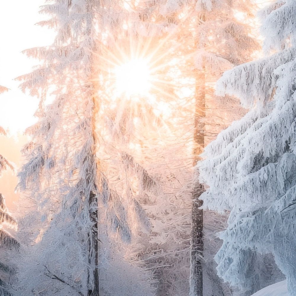 A glittering winter wonderland unfolds as the sun gently peeks out from between the snow-covered fir trees. The frosty veil lends the landscape an enchanting stillness, while the gentle, white hills look inviting. The awe-inspiring beauty of nature catches your breath and whisks you away into a magical, cold embrace.